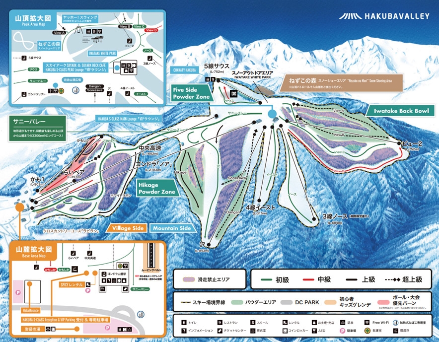 - 標高:白馬五竜:1,676m/Hakuba47:1,614m / 最大斜度:白馬五竜:35度/Hakuba47:32度 / 最長滑走距離:白馬五竜:5,000m/Hakuba47:6,400m